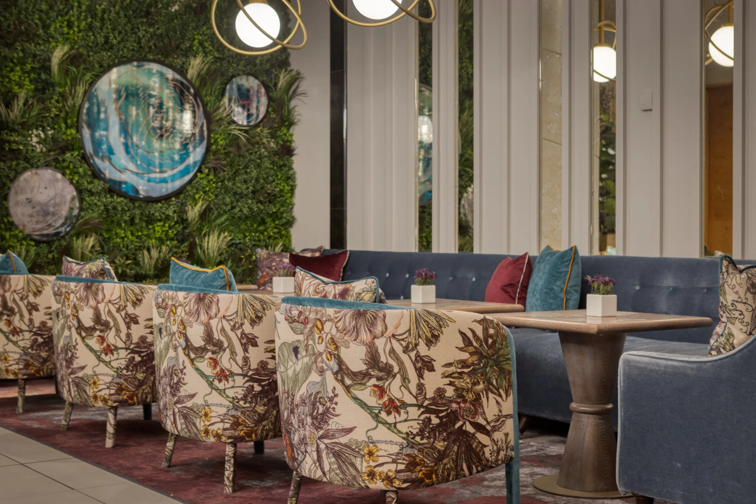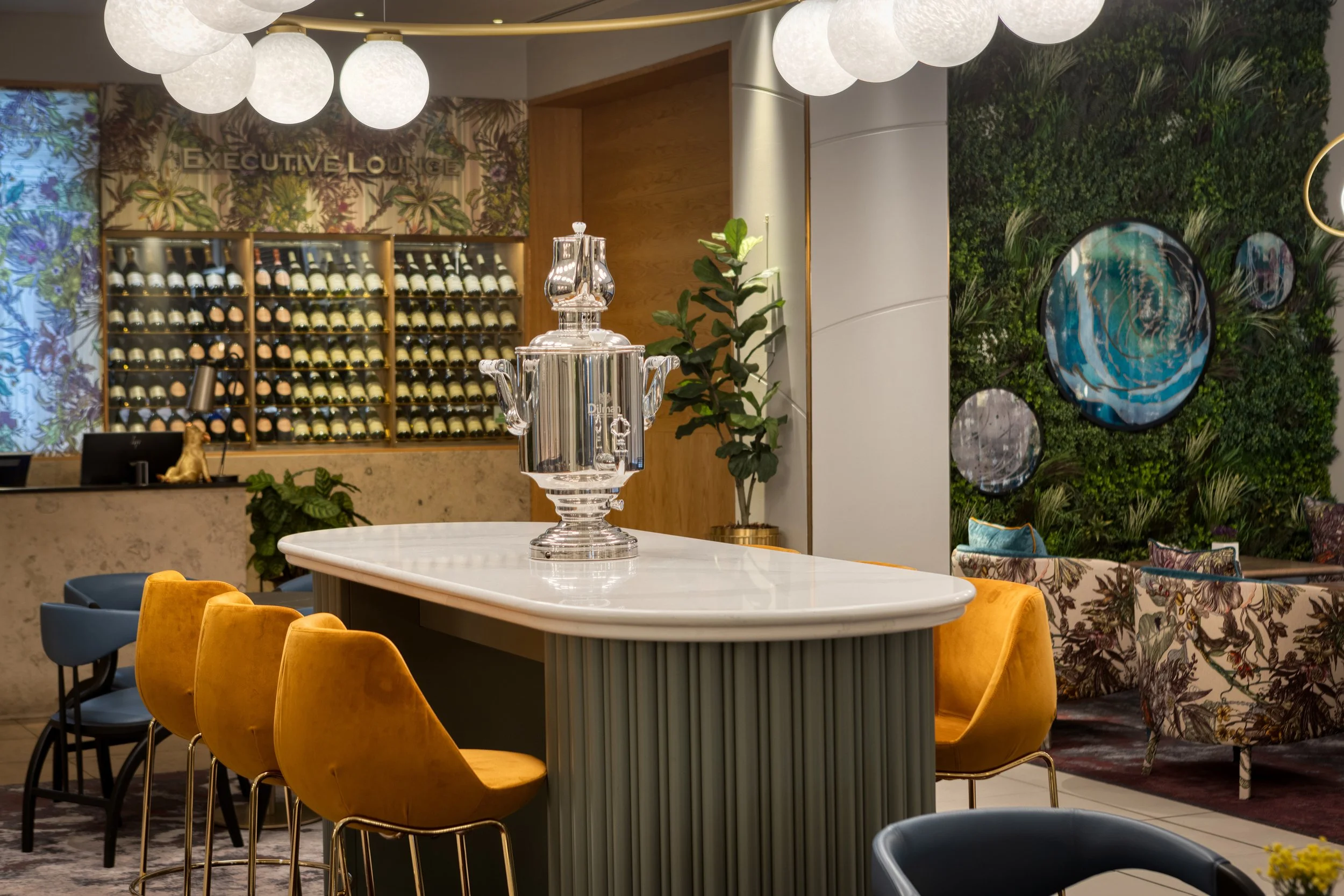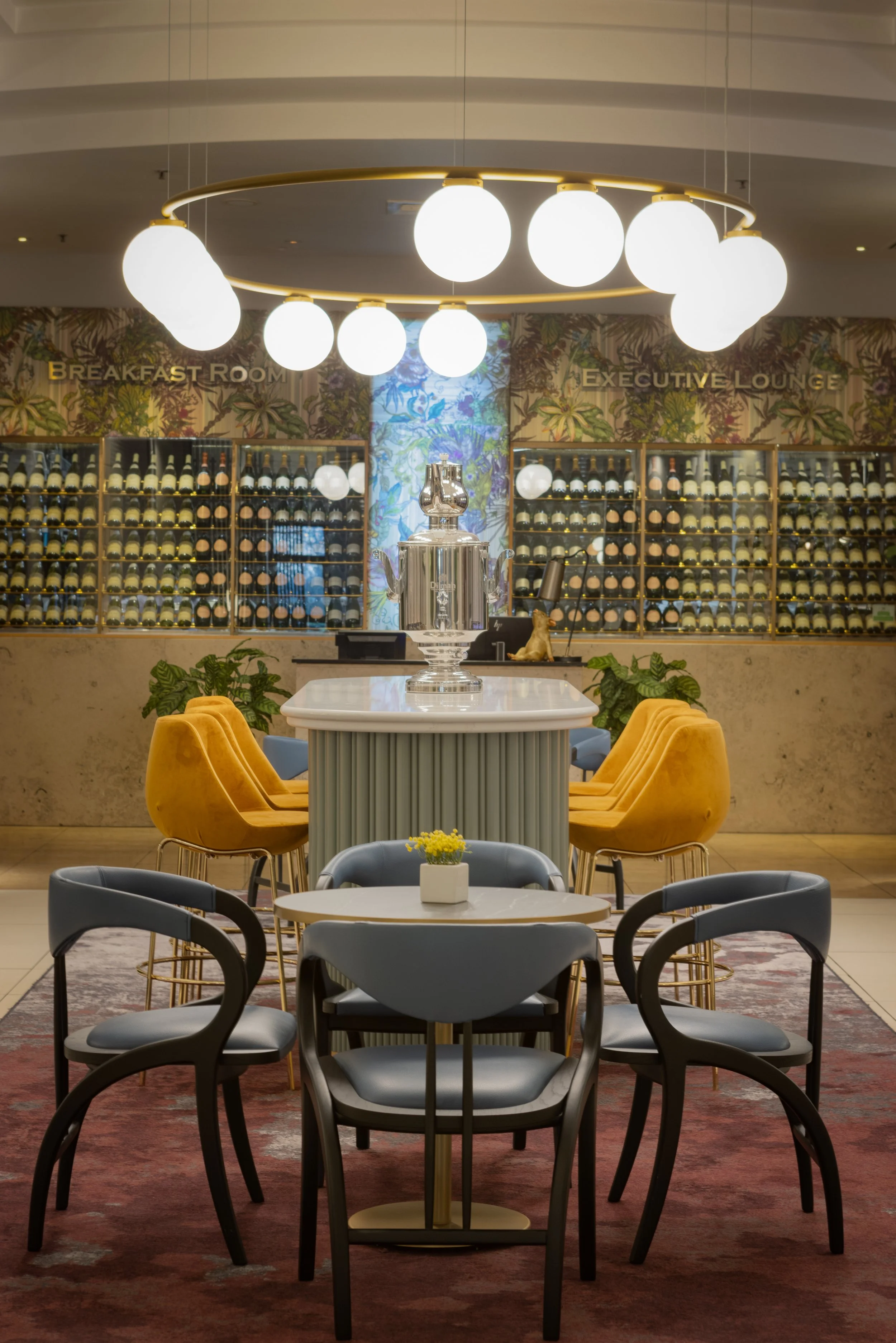 Branching off from the lobby and connecting it to the executive lounge, the Tea Lounge has had a facelift, bringing more character to the space (in line with the overall design narrative of course) and creating a seamless journey from the entrance into the depths of the building. Floral patterns and sumptuous fabrics continue, but the mix of FF&E used here gives it a more fun and playful edge. This space is quite striking and different to the grown-up sophisticated feel of the rest of the spaces. As well as this, we also upgraded the executive lounge too to make it more flexible and work better operationally for the hotel.