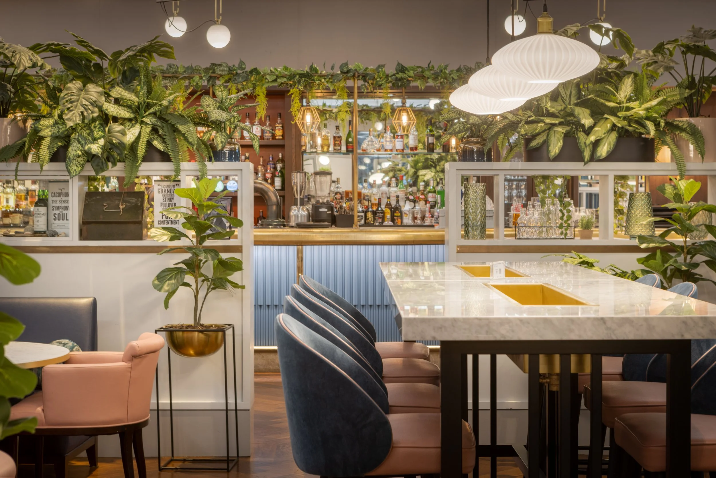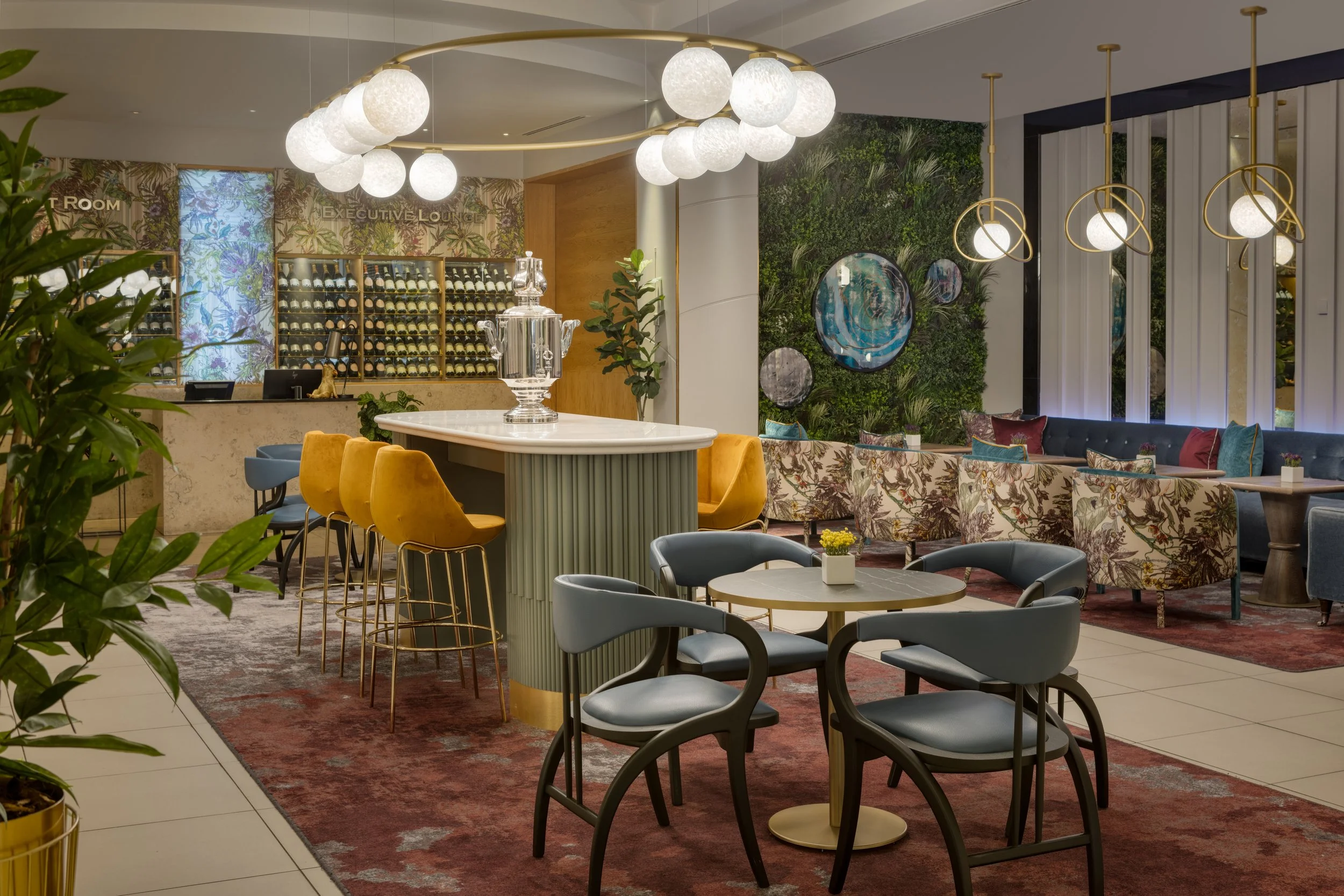 Moving to another area which branches off from the lobby, we couldn’t mention this project and the refurbishment of its common areas without a nod to Whisky Mist - the hotel’s lobby bar and casual dining. It’s not easy to build flexibility into a dining space – creating somewhere that’s just as welcoming and comfortable for a leisurely drink as it is for casual dining. Natural light, a fresh colour scheme, and plenty of foliage were key to creating this deliciously enticing and inviting space.